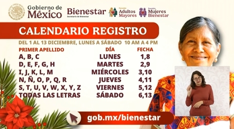 Precisó que el registro se realizará del 15 al 21 de diciembre y la entrega de la Tarjeta del Bienestar se hará el próximo mes de enero.