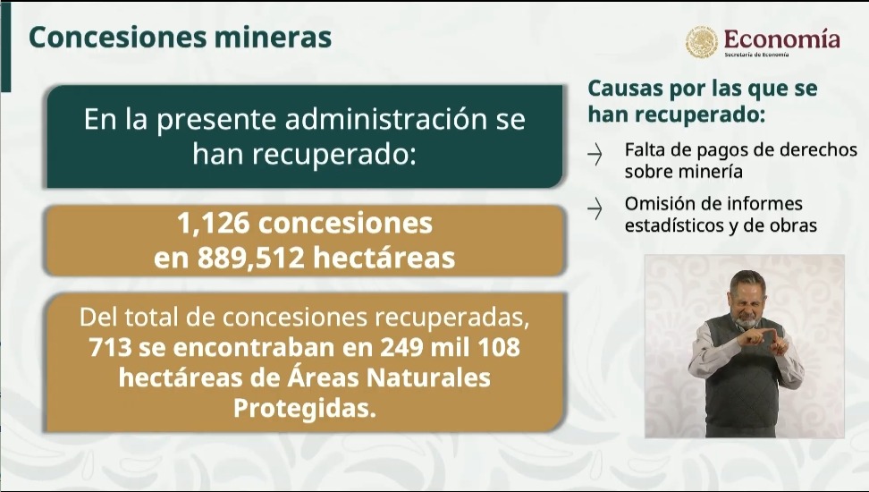 Fernando Aboitiz, Jefe de la Unidad de Conducciones Extractivas explica que la labor comenzó la administración pasada, se han recuperado mil 126 concesiones mineras, con casi 250 mil hectáreas en áreas naturales protegidas.