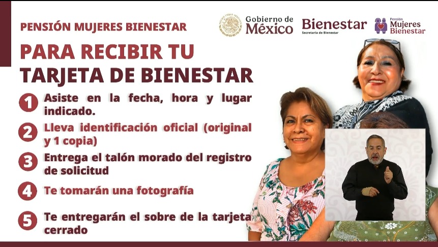 En otro orden de ideas, informa sobre Pensión Mujeres Bienestar, asegura que se han entregado ya varias tarjetas y se prevé entregar 10 millones de tarjetas, asegura que ya se envió un SMS para indicar hora día y lugar para presentarse a recoger su tarjeta, también se puede consultar vía CURP. “hay que ir el día que se convoca o día sábado para rezagadas”.