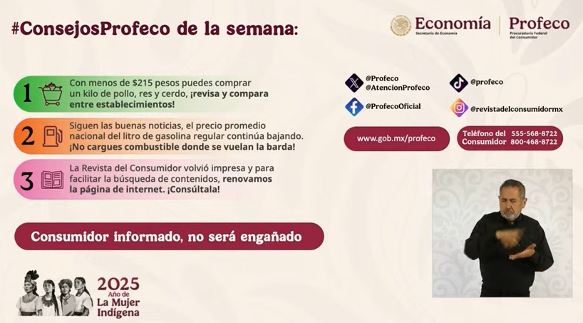 – Profeco, con la sección “Quién es Quién en Los Precios” en la que dará a conocer los costos promedio de la gasolina y la canasta básica, así como recomendaciones para la ciudadanía