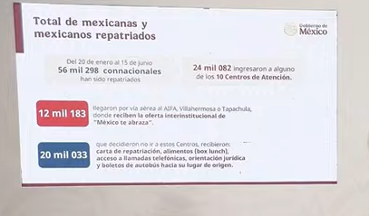 El funcionario indicó que del 20 de enero al 15 de junio, 56 mil 298 connacionales han sido repatriados, 24 mil 82 ingresaron a alguno de los 10 Centros de Atención.