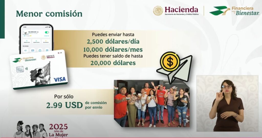 Explicó que el envío de remesas puede hacerse también por medio de la App FINABIEN, con una comisión del 2.99%, la más baja del mercado. Como ejemplo, si se envían 400 dólares, los familiares reciben 7 mil 638 pesos.