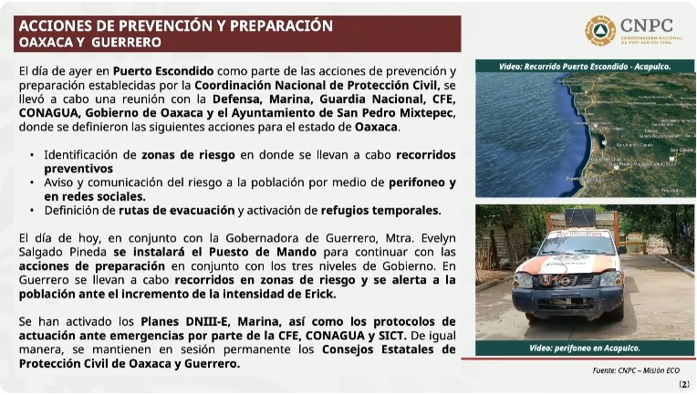Sheinbaum Pardo agrega que también está activo el Plan Marina, igualmente, recomienda no salir de casa de ser posible o evacuar e ir a los albergues si es necesario. Además de estar atentos a toda la información que surja sobe el tema.