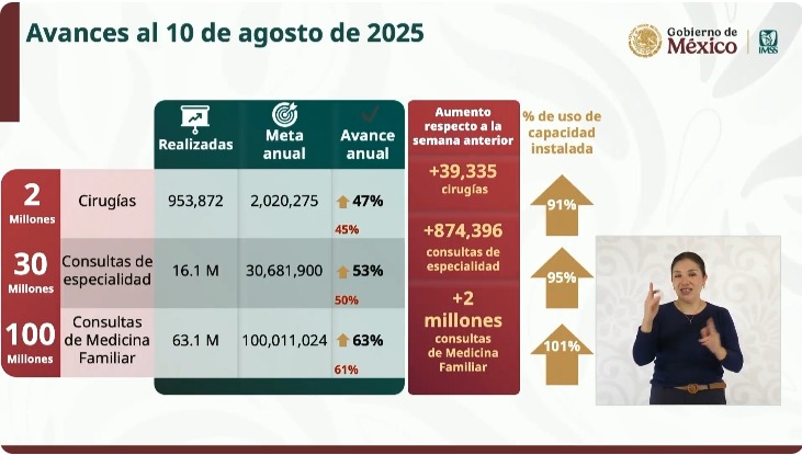 Zoe Robledo, titular del IMSS, habla de los avances en la estrategia 2 30 100; 2 millones de cirugías en 2025; 30 millones de consultas de especialidad 100 millones de consultas de medicina familiar. Los avances van de la siguiente manera: