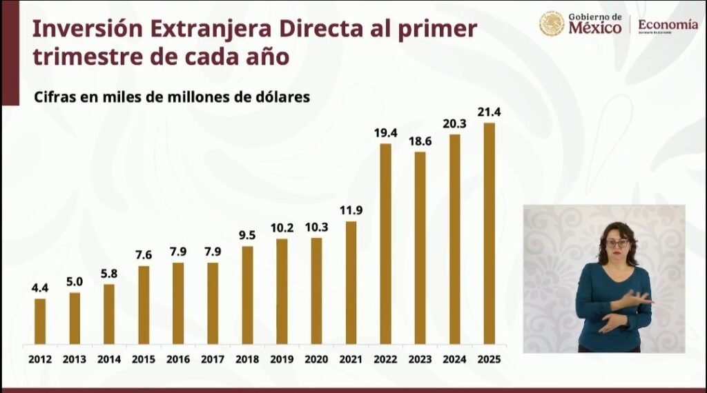 Respecto a cómo va la inversión extranjera directa, el funcionario de Economía explica que, de acuerdo con el último dato, hay 21.4 miles de millones de dólares, lo que marca un crecimiento respecto a años anteriores. “Es un trimestre complejo en el escenario nacional, lo que significa que tenemos más reinversión llegando a nuestro país”.
