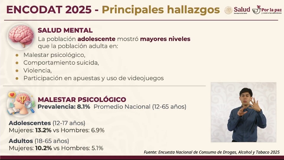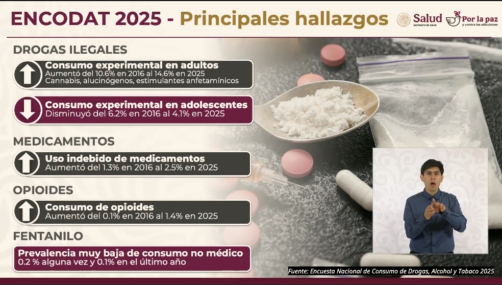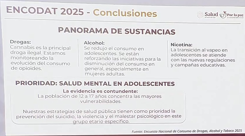 El funcionario concluye que el cannabis es la principal droga que se consume en México. Precisa que el principal objetivo de la ENCODAT es atender a la población de 12 a 65 años, reducir el consumo de drogas, vigilar su salud mental y procurar su bienestar.