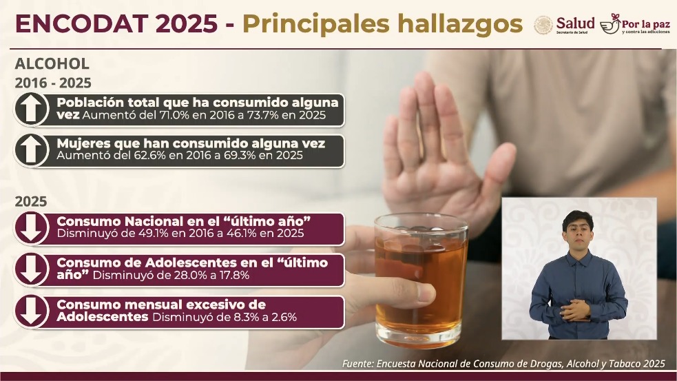 Para el caso del alcohol, subió la población que lo ha consumido alguna vez, las mujeres que lo han probado, mientras que disminuyeron los consumos nacionales, la ingesta de adolescentes y el consumo mensual excesivo.