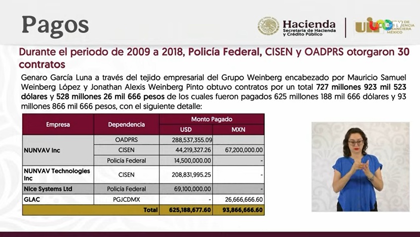 Goméz informó que García Luna obtuvo en el periodo de 2009 a 2018, durante las administraciones de Felipe Calderón y Enrique Peña Nieto, contratos por el CISEN y la PFP por un total de 725.9 millones de dólares.