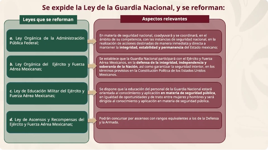 La funcionaria explica también las modificaciones a las leyes concernientes a la Guardia Nacional. El paquete de reforma permite la armonización de las leyes a al reforma constitucional. Entre lo más destacado se encuentra la ubicación de la Guardia a la altura del Ejército Mexicano. El objetivo es mantener el orden y la paz social, que se regirá por el respeto a los Derechos Humanos .