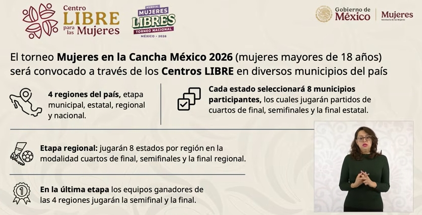 En su intervención en la mañanera, Citlali Hernández, titular de la Secretaría de las Mujeres, habló sobre el Mundial Mujeres Libres: Torneo Nacional, el cual, dijo, es creado por gracias al trabajo interinstitucional del Gobierno de México.