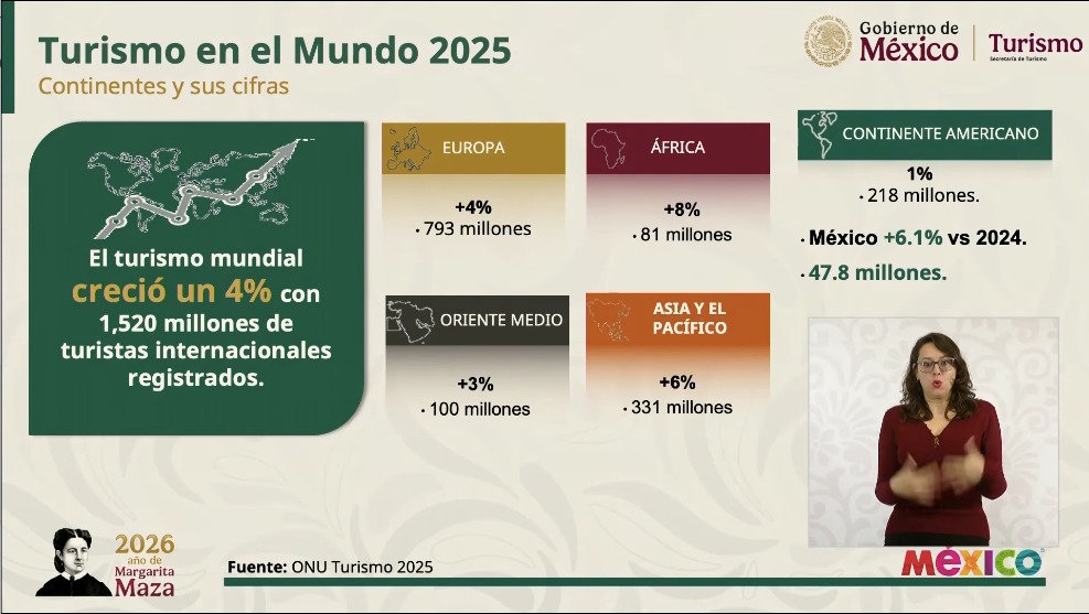 Josefina Rodríguez Zamora, secretaria de Turismo, explica el panorama mundial de esta actividad en el mundo, precisa que México es el que más crece en América Latina y en el mundo, en millones de turistas.
