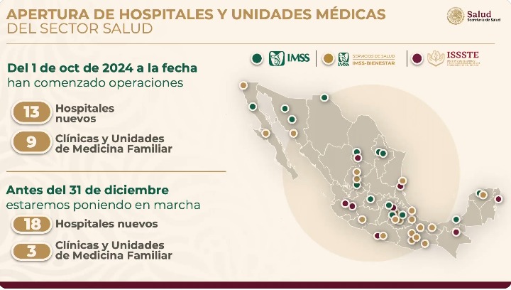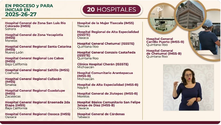 Anuncia 20 nuevos hospitales que están en construcción o prontos a terminarse, son 31 hospitales y 12 clínicas que se inaugurarán entre octubre y el 31 de diciembre de 2025.