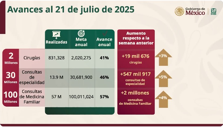 Zoé Robledo habla de la estrategia 2-30-100, 2 millones de cirugías para 2025, 30 millones de consulta de especialidad y 100 millones de consultas en Medicina Familiar. Asegura que los avances son los siguientes: