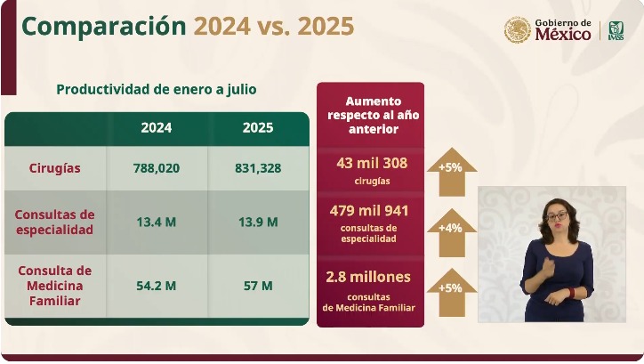 Expone también que de 2024 a 2025 se han incrementado la cantidad de servicios médicos brindados, mediante la implementación de la estrategia, la contratación de personal médico y la habilitación de quirófanos.