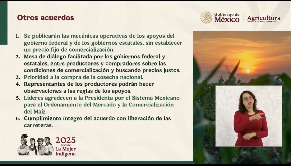 “Alrededor de las 2:00 de la madrugada logramos un acuerdo con los liderazgos locales con productores de Jalisco, Guanajuato y Michoacán… El tema de fondo es que hemos tenido un aumento enorme en la disponibilidad de maíz en el mundo, hay un stock récord y México tendrá una muy buena cosecha, también las presas están con muy buen volumen en el norte y será del doble o más del doble que el año pasado. Este volumen de maíz presiona a ala baja los precios mundiales y México no escapa al a tendencia, el precio ha caído 21% en pesos, con los precios más bajos desde 2017… así es que surge el descontento y se atendió por instrucciones de la presidenta”