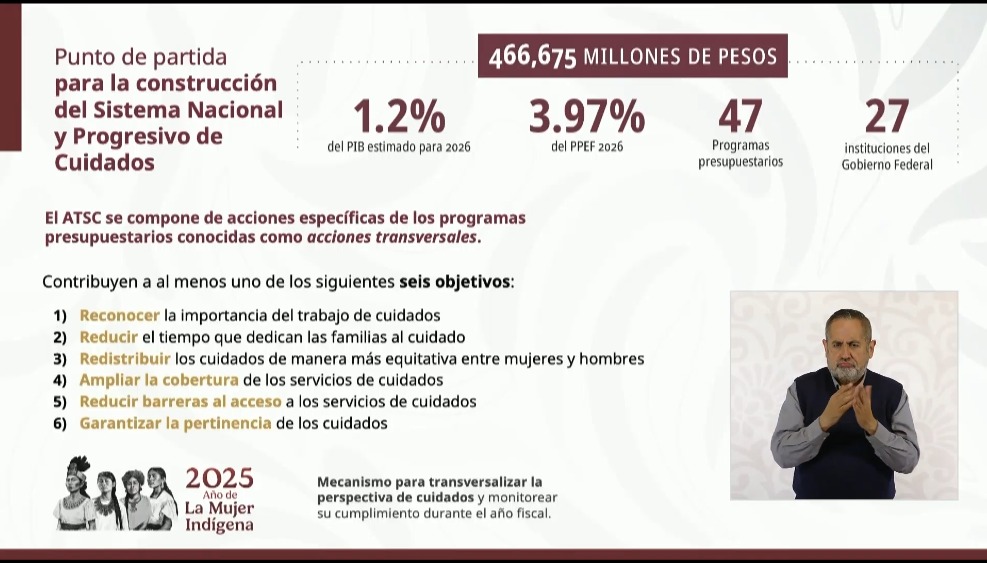 La funcionaria comenta que no se destinarán nuevos recursos para este tema, sino que se cuantificará lo que ya se destina desde hoy a cuidados, cita el ejemplo de la Pensión Mujeres Bienestar que ya reconoce esta labor de la mujer como cuidadora histórica.