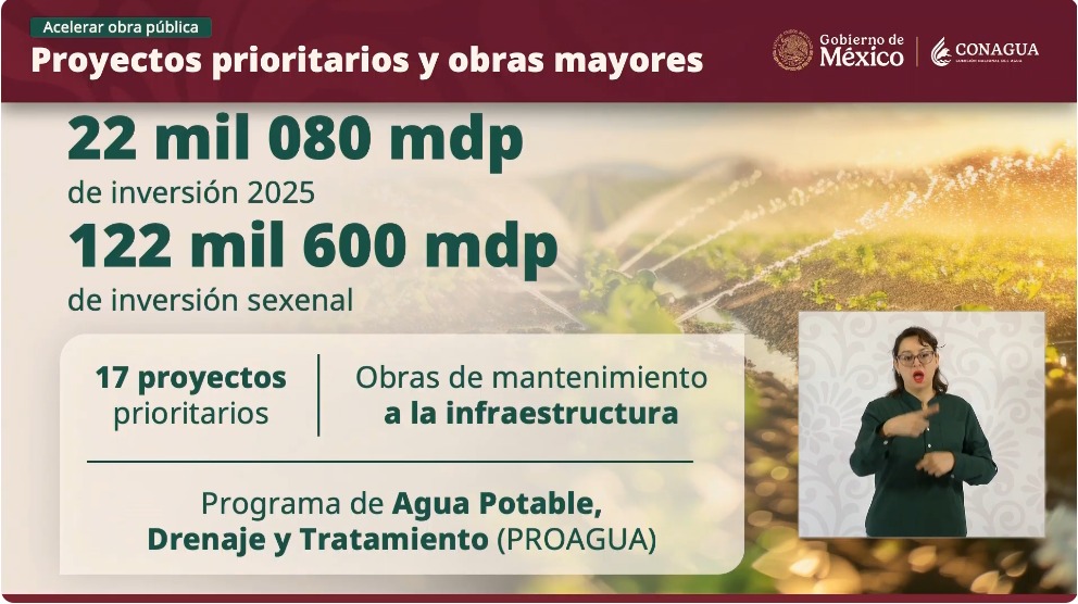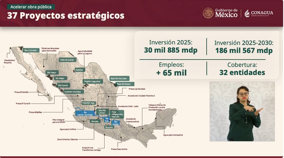 Efraín Morales López, de la Comisión Nacional del Agua, anuncia una inversión de 30 mil 885 millones de pesos en 2025, para generar más de 65 mil empleos. Se busca llegar a un total de 186 mil millones de pesos de inversión en el sexenio.