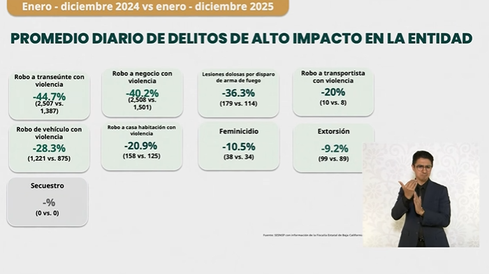 Con respecto al promedio diario de delitos de alto impacto, de septiembre de 2024 a diciembre de 2025, hubo una disminución del 38%, al pasar de 10.43 a 6.48.