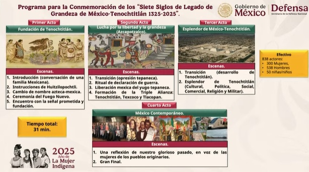 El 26 de julio 2025, a las 10:00 horas, la Sedena llevará a cabo una representación escenográfica de algunos de los momentos más emblemáticos de Tenochtitlán y del pueblo mexica.