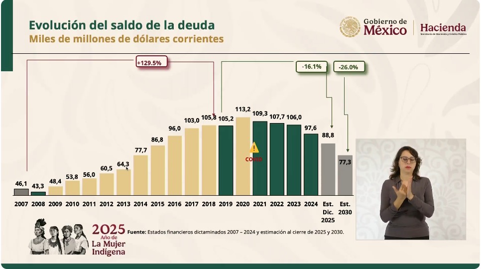 “Pemex es solvente, pero tiene una deuda muy grande… en dólares, en pesos, en bonos del mercado, es una deuda compleja… por eso tiene que haber apoyo del presupuesto, éste y el siguiente año, lo que no ocurrirá en 2027, Pemex pagará sólo sus amortizaciones”, explica la presidenta.