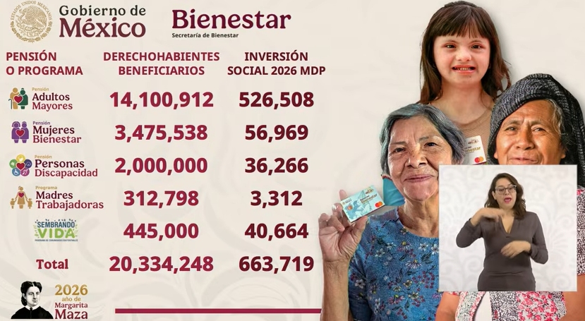 La meta para 2026, sostuvo, es que el padrón sea de 20.3 millones de beneficiarios de los programas y pensiones de Bienestar, con una inversión de 663 mil 719 millones de pesos.