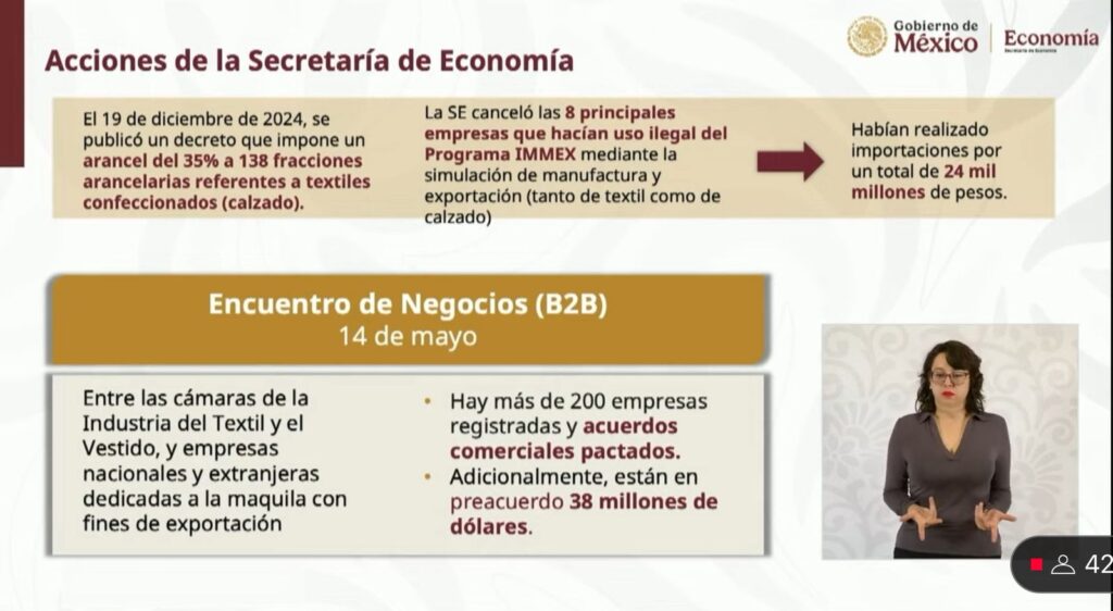 En el caso de la industria textil, preciso que el 19 de diciembre de 2024 se publicó un decreto que impone un arancel de 35% a 138 fracciones arancelarias referentes a textiles confeccionados.