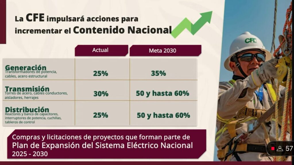 La secretaría de Energía, Luz Elena González, indicó que la Comisión Federal de Electricidad (CFE) impulsará acciones para incremental el contenido nacional de energía a través de compras y licitaciones de proyectos que forman parte del Plan de Expansión del Sistema Eléctrico Nacional 2025-2030.