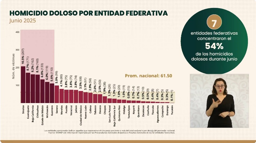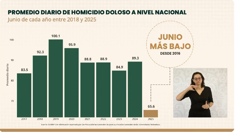 Marcela Figueroa, Secretaria Ejecutiva del Sistema Nacional de Seguridad Pública, informa que, con base en información de las 32 fiscalías, se aprecia una tendencia sostenida a la baja de los homicidios dolosos, para junio se registró una baja en nueve meses de más del 24%