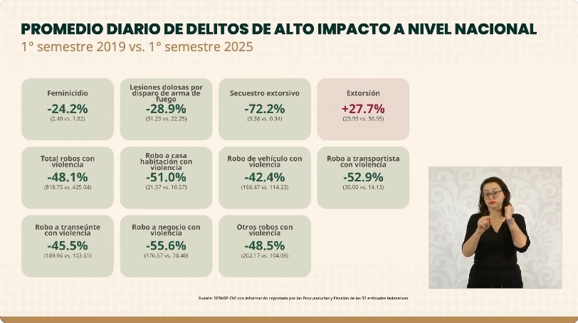 Sobre los delitos de alto impacto, la funcionaria informa que tienen también una tendencia sostenida a la baja del 20.2%.