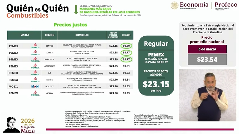 En su intervención en la mañanera, Iván Escalante, titular de Profeco, destaca que el precio promedio de la gasolina se ha mantenido en menos de 24 pesos, aunque sostuvo que hay algunas zonas donde siguen cobrando más de lo que se debe.