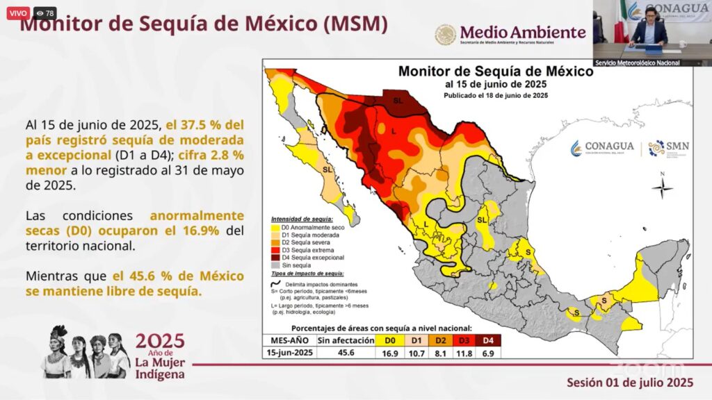 Alejandro García, subgerente de Climatología y Servicios Climáticos del SMN, detalló que el 37.5% del país presenta sequía de moderada a excepcional (niveles D1 a D4), lo que significa una reducción de 2.8 puntos porcentuales en comparación con el corte anterior al 31 de mayo.