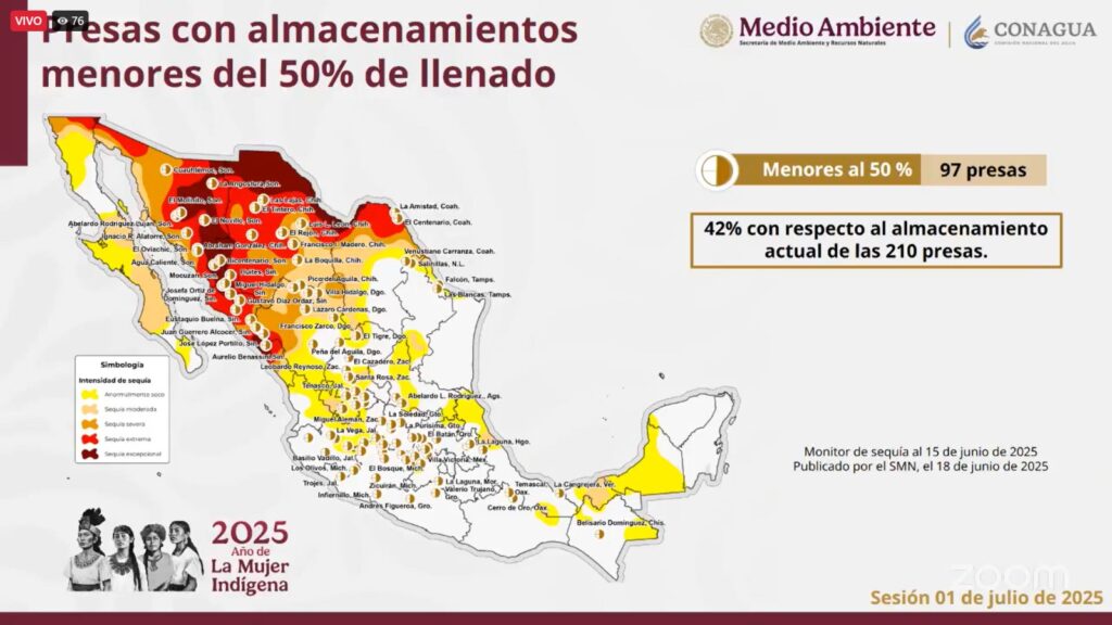 “Se presentan las presas con almacenamientos menores al 50% de llenado y en esta categoría se ubican 97 presas que en conjunto representan el 42%”, puntualizó.