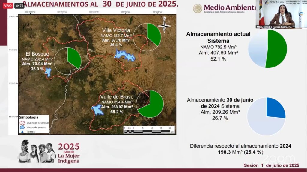 El Sistema Cutzamala también presenta señales positivas. Al 30 de junio, el almacenamiento se ubicó en 52.1%, un incremento de 3.2% en dos semanas, lo que lo saca de los mínimos históricos, confirmó Citlalli Peraza Camacho, directora del Organismo de Cuenca Aguas del Valle de México.