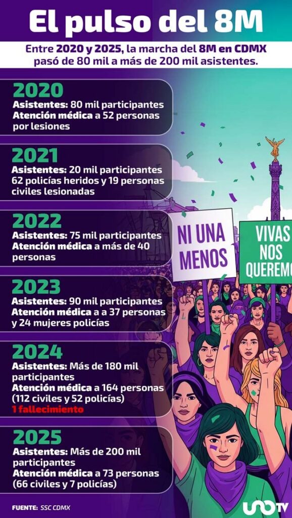 Para 2025, el crecimiento fue contundente, porque, de acuerdo con reportes oficiales, más de 200 mil mujeres participaron en la marcha, la cifra más alta.