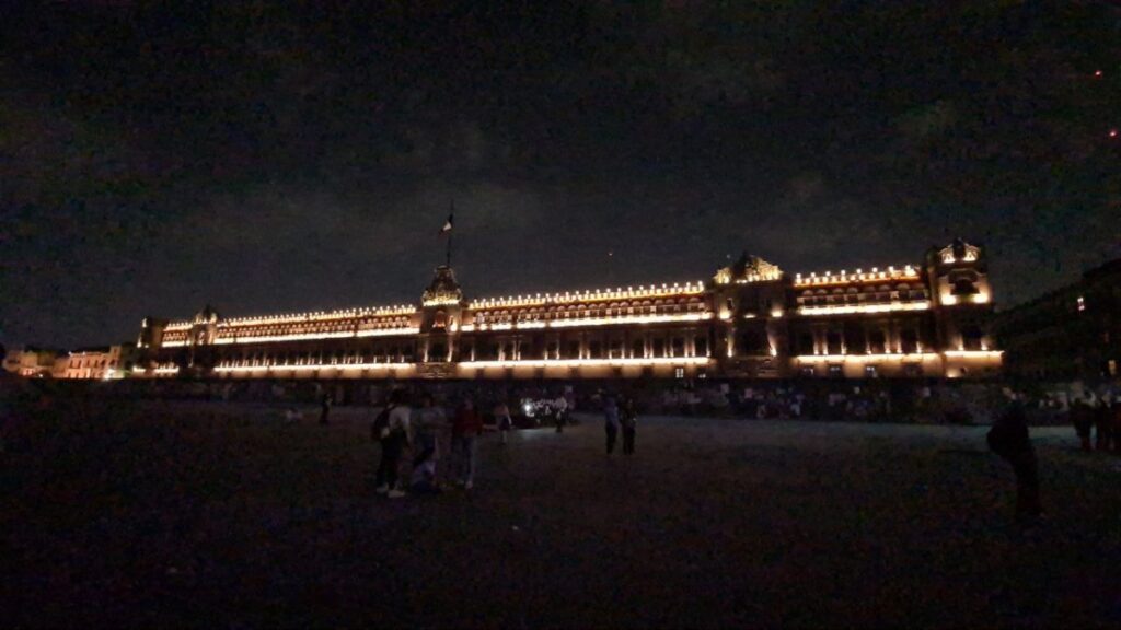 Mientras siguen los destrozos en el edificio del Gobierno capitalino, Palacio Nacional prende su luz.