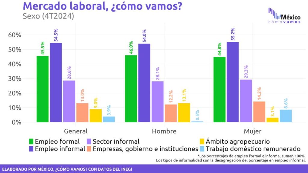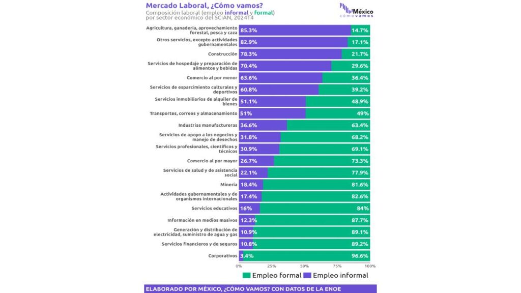 El 54.5 % de la población ocupada en México tiene un empleo informal, reveló un análisis de México cómo vamos, basado en datos del cuarto trimestre de 2024. Esto significa que más de la mitad de quienes trabajan lo hacen sin acceso a seguridad social ni protección legal, una falla estructural persistente en la economía mexicana.