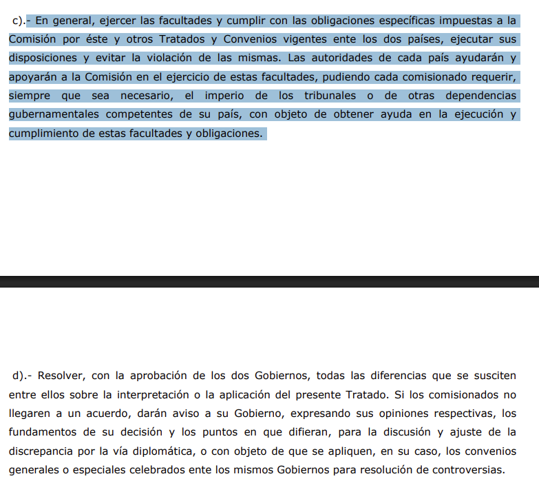 El tratado no contempla sanciones automáticas por incumplimiento. Sin embargo, faculta a ambos países a resolver diferencias mediante la Comisión Internacional de Límites y Aguas. En caso de no llegar a acuerdos, pueden recurrir a mecanismos diplomáticos o, en última instancia, a la Corte Internacional de Justicia (CIJ).