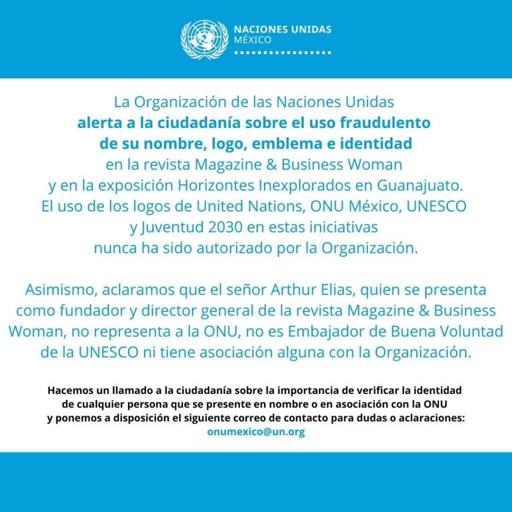 La Organización de las Naciones Unidas (ONU) en México lanzó una alerta pública por el uso fraudulento de su nombre, logotipo e identidad institucional en la revista Magazine & Business Woman y en la exposición Horizontes Inexplorados, llevada a cabo en Guanajuato.