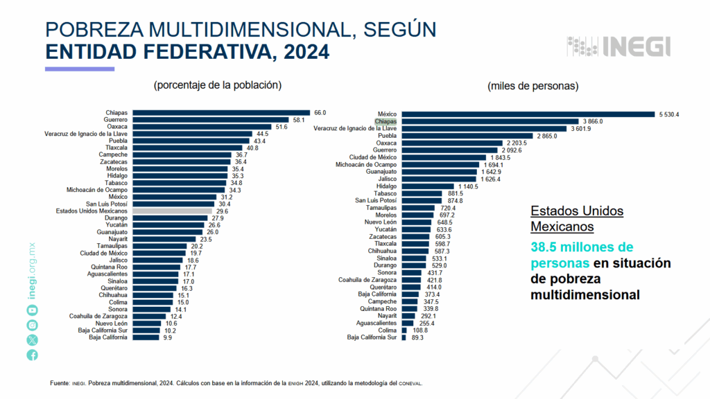 Además de Chiapas, los estados con mayor pobreza multidimensional en 2024 fueron Guerrero con 58.1 % y Oaxaca con 51.6 %.