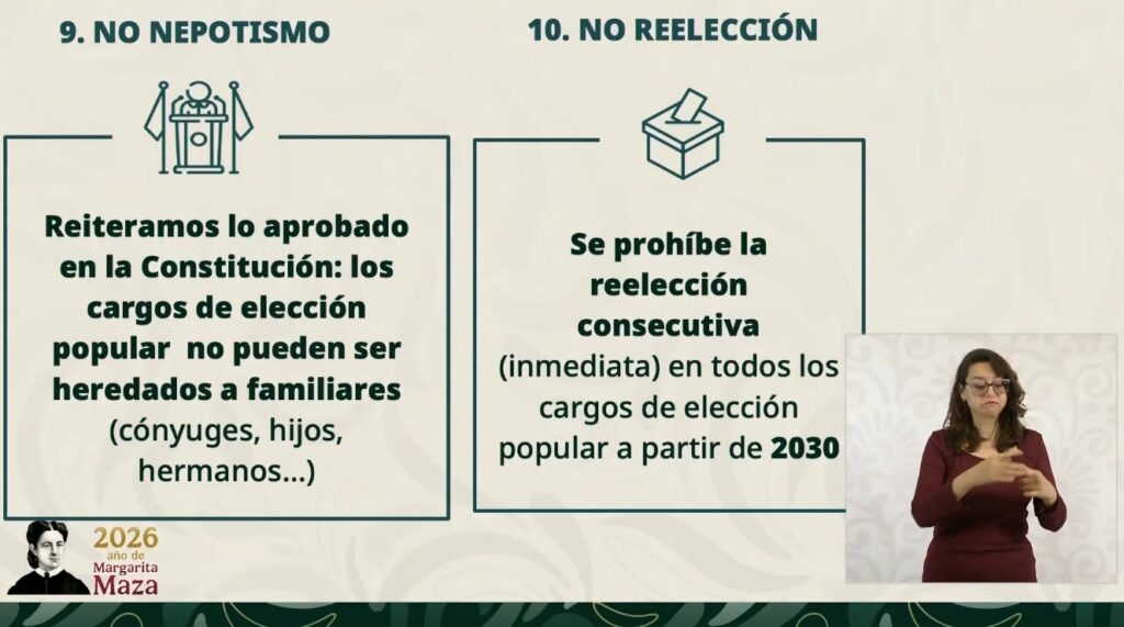 Se prohíbe, además, que se hereden los cargos de elección o que las ocupe un familiar directo o cónyuge.