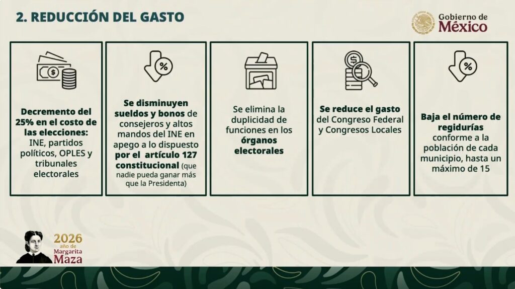Decremento del 25% en el costo de las selecciones. Además, se disminuyen sueldos y bonos; se elimina duplicidad de funciones, se reducirá el gasto en el Congreso Federal y Local y se reduce el número de regidurías.