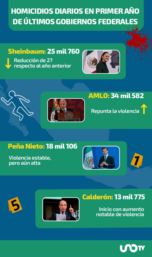 Aunque la cifra global sigue siendo elevada, el promedio diario evidencia una tendencia a la baja, lo que contrasta con el inicio del gobierno de Felipe Calderón, quien reportó 13 mil 775 homicidios, marcando el arranque de un sexenio con un incremento significativo de la violencia.