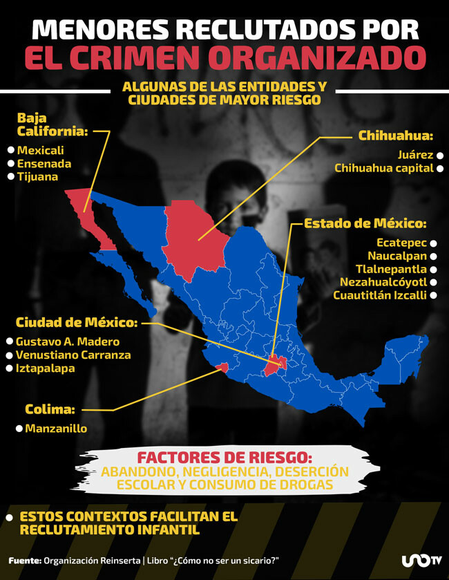 El libro incluye un mapa de riesgo con las entidades donde las infancias están más expuestas al reclutamiento: Baja California, Chihuahua, Colima, Ciudad de México y Estado de México.