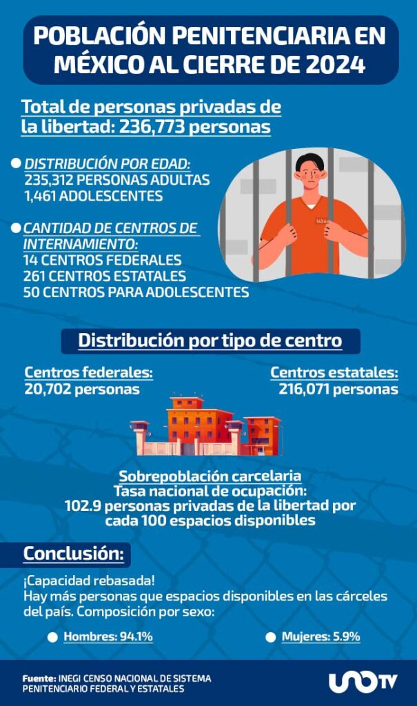 Al cierre de 2024, la población privada de la libertad sobrepasó la capacidad de los más de 300 centros de internamiento, entre federales, estales y de atención a adolescentes.