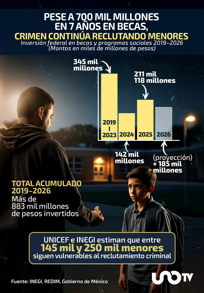 En México, entre 145 mil y 250 mil menores se encuentran en riesgo de ser reclutados por el crimen organizado, según datos de Unicef e Inegi. A pesar de que el Gobierno de Claudia Sheinbaum destinará en 2026 más de 185 mil millones de pesos a becas como parte de su estrategia de atención a las causas, las cifras oficiales muestran que los esfuerzos no han sido suficientes para detener la captación de niñas, niños y adolescentes por agrupaciones delictivas.