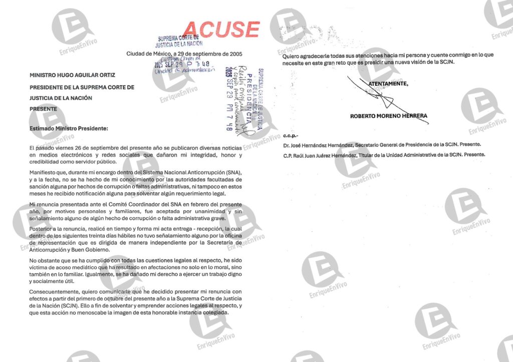 “Quiero comunicarle que he decidido presentar mi renuncia con efectos a partir del primero de octubre del presente año a la Suprema Corte de Justicia de la Nación (SCJN). Ello a fin de solventar y emprender acciones legales al respecto, y que esta acción no menoscabe la imagen de esta honorable instancia colegiada”, se lee en la misiva.