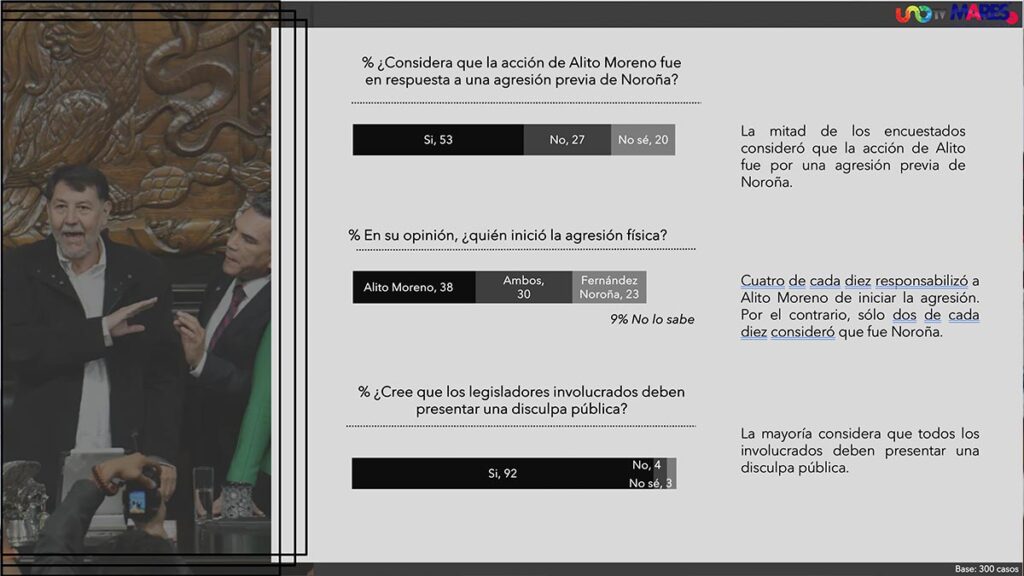 Según el estudio, cuatro de cada 10 encuestados señalaron a Moreno como responsable de iniciar la agresión, mientras que dos de cada 10 culparon a Fernández Noroña. Aun así, la mitad de los consultados cree que la reacción del priista fue consecuencia de una provocación del morenista.