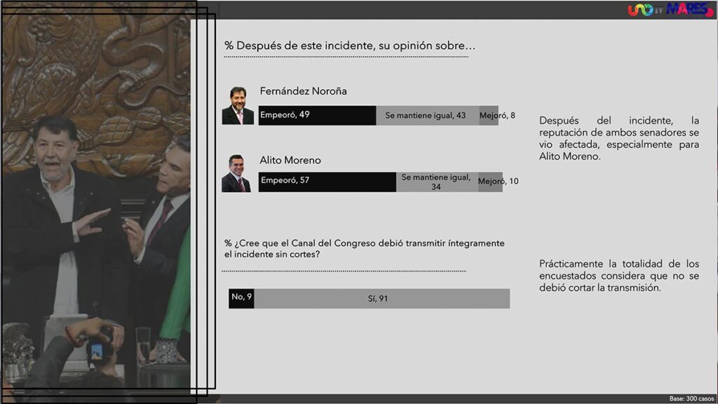 La encuesta, realizada a 300 personas que consumen medios informativos, reveló que ocho de cada 10 mexicanos conocieron el incidente gracias a redes sociales. Además, nueve de cada 10 opinaron que las amenazas intercambiadas son un asunto grave, lo que aumentó la percepción negativa hacia ambos senadores.