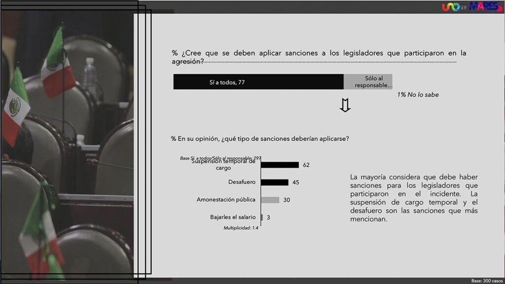 Entre las medidas que la gente mencionó como necesarias están la suspensión temporal del cargo y el desafuero. Asimismo, casi todos los participantes en el sondeo consideraron que el Canal del Congreso debió transmitir el incidente completo, sin cortes.