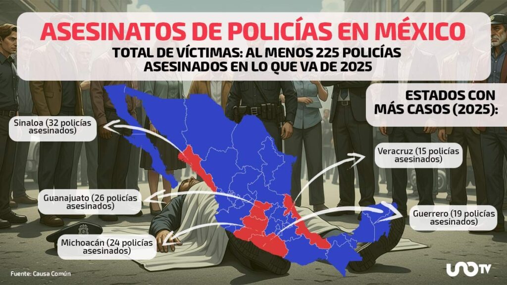 De acuerdo con el registro de Causa en Común, hasta el 17 de julio se contabilizan 225 homicidios de elementos policiales, un promedio de uno por día, con un incremento del 37% respecto al mismo periodo del año anterior.